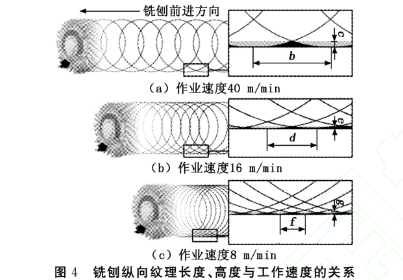銑刨面縱向紋理的間距深度則與工作速度、刀尖線速度有關(guān)。圖4為銑刨縱向紋理長度、高度與工作速度的關(guān)系,可見銑刨作業(yè)速度越快,銑刨的紋理長度越長(如圖4所示,紋理長度b>d>f)、紋理高度越高(如圖4所示,紋理高度c>e>g),則表面越粗糙;反之,作業(yè)速度越慢,紋理越細(xì)密。而刀尖線速度則與銑刨轉(zhuǎn)子直徑和轉(zhuǎn)速有關(guān),銑刨轉(zhuǎn)子直徑越大,轉(zhuǎn)速越高,銑刨紋理就越密,這兩個(gè)參數(shù)與銑刨機(jī)廠家設(shè)計(jì)有關(guān)。